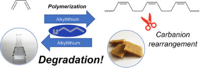 传统橡胶降解方法多以自由基机理为主,常需要高温、高压的反应条件,能耗巨大。本工作发现烷基锂/N,N,N',N'-四甲基乙二胺体系在室温或更高温度下引起聚二烯烃降解。 橡胶的数均分子量在几分钟内从几十万下降到几千。在适宜条件下,分子量可降低数百倍,并且迅速由橡胶转变为具有相当低粘度的液体低聚物。 通过调节反应条件,可以在很宽的范围内精确控制聚合物的分子量。反应在温和条件下即可进行,无需高温高压条件。多种橡胶均可使用此方法进行降解,包括顺丁橡胶 (PB)、高乙烯基聚丁二烯 (HVPB)、聚异戊二烯橡胶(PI) 和天然橡胶 (NR)等。