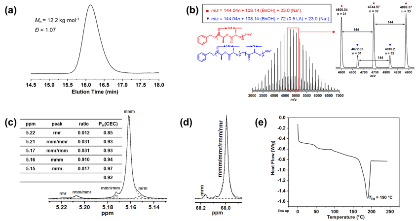 聚乳酸(PLA)具有优异的生物可降解性和生物相容性,并且其力学性能与传统聚烯烃材料相当,是最具潜力的可降解塑料之一。PLA全同立构复合物的Tm高达230 °C,可以通过外消旋丙交酯(rac-LA)的立构选择性开环聚合来制备。然而,在温和条件下,有机催化rac-LA高效、高立构选择性开环聚合合成高结晶、高熔点全同立构复合物仍然是一个巨大的挑战。