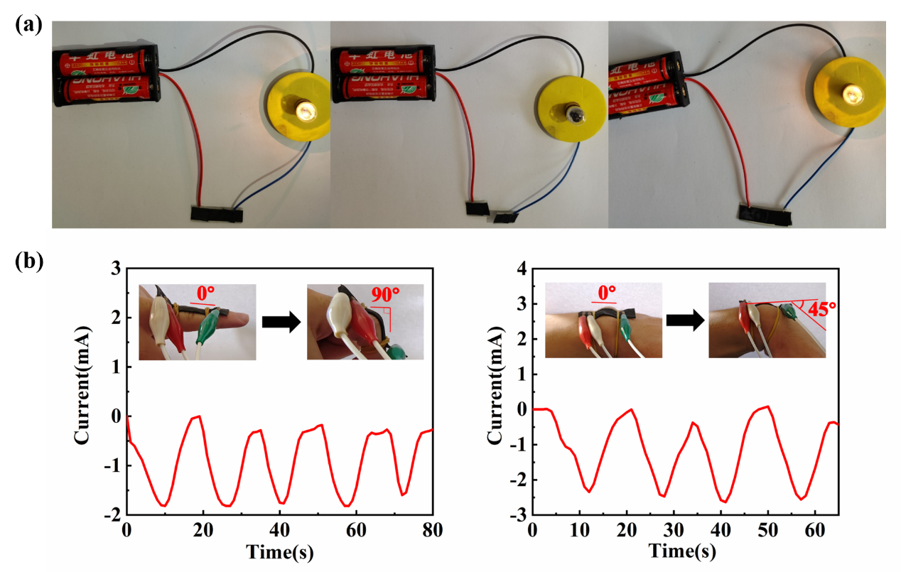 图4.(a)导电回路中自愈电极愈合前后的照片,(b)采用PDMS-U/PDMS-C0.3/Zn2+薄膜作为柔性电极的支撑材料,用于监测手指运动和肘部运动