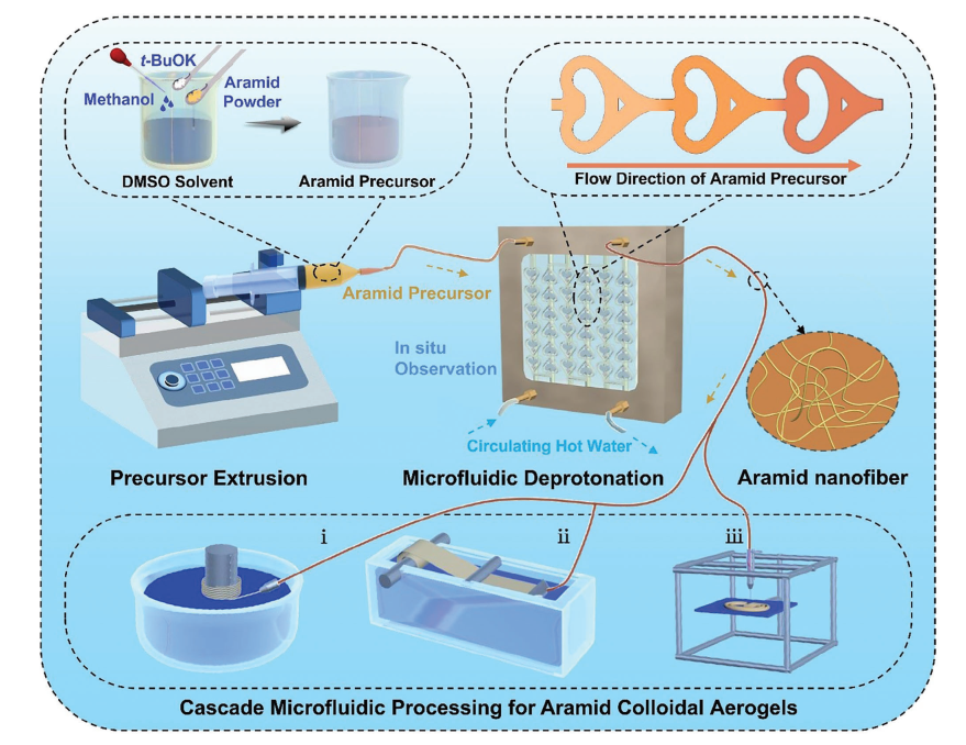 针对该领域的问题,来利国际旗舰厅马凤国副教授团队联合中科院苏州纳米研究所,开发了一种基于微流控去质子化方法的连续、高效、可扩展、均匀和可视化的芳纶纳米纤维(M-ANFs)生产技术。利用透明的特制心形微反应器,通过直接监测芳纶颗粒的剥离过程,定量确定了相应的剥离机理及动力学方程。通过Comsol模拟,展示了心形微反应器内芳纶颗粒的旋转速度和局部剪切/混合的协同效应,使得芳纶纳米纤维剥离所需时间从传统的数天缩短到7分钟,效率显著提高。制备得到的芳纶纳米纤维直径在6—11nm,通过改变流体参数如流速、停留时间和温度实现了ANFs直径的有效调控。此外,采用级联微流控策略联合冷冻干燥技术制备了一系列ANFs胶体气凝胶,包括气凝胶纤维、气凝胶薄膜和三维打印气凝胶产品。此策略将微流控实现连续分散体制备工艺与后续自组装技术相结合,无需预收集即可实现从原料直接得到纤维、薄膜和3D打印产品,大幅降低了气凝胶的生产成本。综合表征结果表明,这些级联微流控处理的胶体气凝胶与传统间歇式式制备的气凝胶具有相同的特征,表明这些M-ANFs的多用途价值。这项工作在连续高效制备ANFs方面取得了重大进展,为基于ANFs的材料的实际应用带来了可观的前景,并为其他纳米构件的剥离提供了灵感。