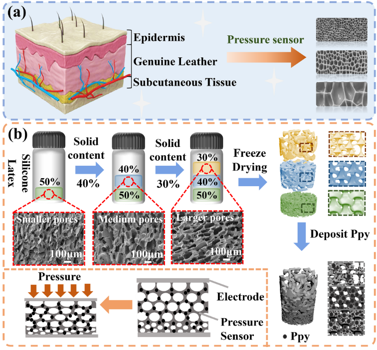 图1 (a)皮肤梯度结构的生物灵感; (b)柔性压力传感器制备示意图。