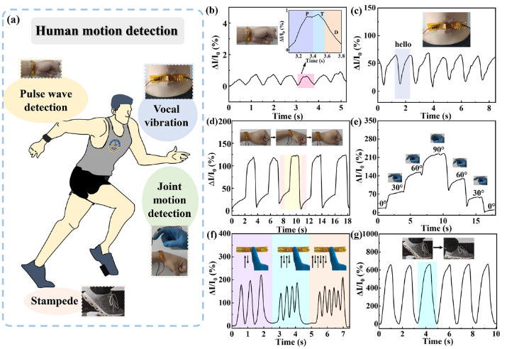 图2(a)人体运动检测示意图; (b)尺动脉(插图为单个脉冲信号的变化),(c)说“你好”,(d)手腕屈曲,(e)手指关节,(f)手指按压,(g)人体踩在传感器上的光学图像和相对电流变化。