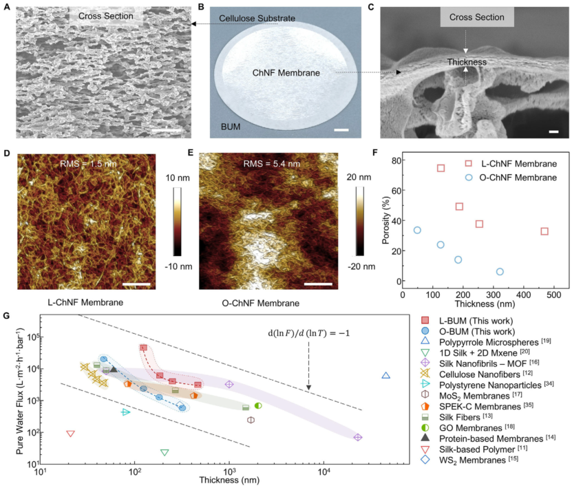 图3:由 ChNF 构建块构建的 BUM 的结构和水通量。A–C) 纤维素支撑体的横截面 SEM 图像 (A; 比例尺, 10 μm);由纤维素支撑体和 ChNF 膜组装的 BUM 的照片 (B; 比例尺, 0.5 cm);ChNF 膜的横截面 SEM 图像 (C; 比例尺, 100 nm)。D,E) L-ChNF 膜 D) 和 O-ChNF 膜 E) 的 AFM 图像 (比例尺, 200 nm)。F) L-ChNF 和 O-ChNF 膜的厚度和孔隙率之间的关系。G) 本工作中的 BUFs 与其他报道的薄过滤器的纯水通量比较。