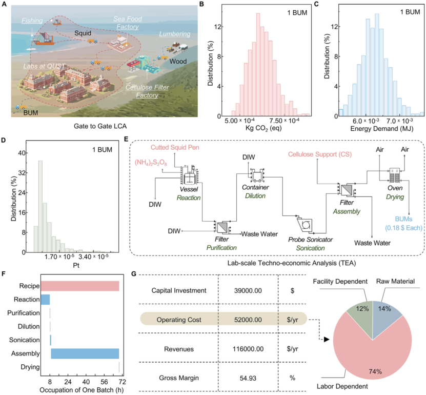 图5:L-BUM 的 LCA 和 TEA 评估。A) 从门到门(红色虚线,系统边界)生命周期评估 (LCA) 的示意图,用于 1 个产品(1 片 BUM)。B–D) 碳足迹 B)、能源需求 C) 和环境损害潜力 D) 的不确定性分析。E) 实验室规模 BUF 生产的 TEA 建模的示意图工作流程。F) 单批次 BUF 生产期间的设备占用(从 6 g SPW 到 14 000 片 BUMs)。G) BUM 生产的经济评估报告 (EER)。