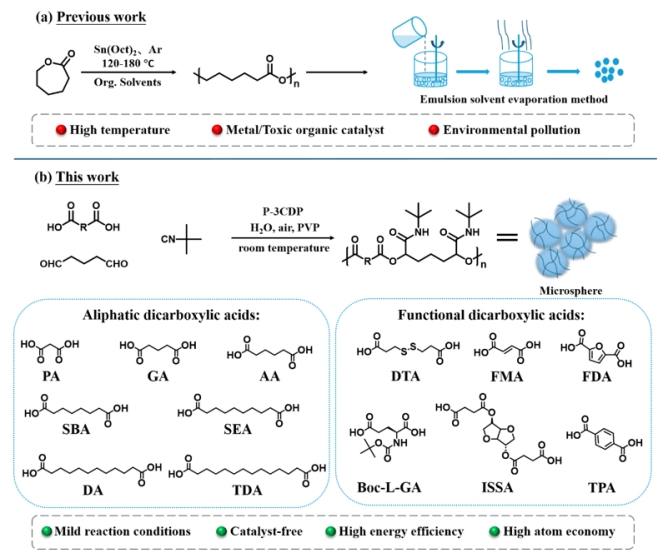 传统聚酯微球制备常依赖有机溶剂、金属催化剂及高温条件,过程复杂且环境污染大。该研究创新性地将帕塞里尼三组分反应与分散聚合结合,开发出水相Passerini三组分分散聚合技术。该方法在常温常压下进行,无需催化剂与有机溶剂,一步即可合成结构多样的聚酯微球,实现了从脂肪链到含苯基、生物基异山梨醇、刺激响应性基团(如二硫键与pH响应性Boc-保护的谷氨酸)等多种主链结构的精准构筑。实验表明,所得微球粒径在515–2391 nm范围内可调,生物相容性优异,细胞存活率超过93%。以含Boc-保护谷氨酸的微球为例,其在酸性条件下可发生自降解行为,展现出良好的刺激响应性能,在药物控释、组织工程等生物医学领域具有广阔应用前景。