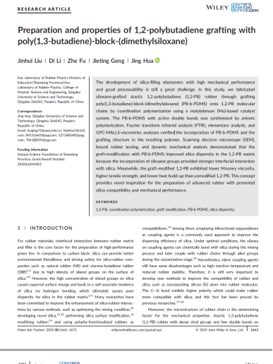 1.成果1:(简要介绍成果名称、完成人、内容、获奖(出版、发表)和应用成效等情况,限200字以内,并在结尾处标注“证明材料”页码,下同) ……主要研究高分子材料的合成、结构与性能,功能高分子材料及分子化学工程。突出高分子合成及橡胶工程研究特色,围绕本领域关键性、基础性课题积极开展创新性研究,包括双烯烃橡胶的合成(高乙烯基聚丁二烯、稀土异戊橡胶、稀土顺丁橡胶等的结构设计):包括催化剂制备、聚合物结构控制、结构测试表征、加工流变性、物理力学以及应用配方;另外,橡胶的功能化研究:有机无机杂化材料的制备和性能研究。发表相关论文,如下: 1. SCI论文,Yang Liu,Qiu Han, Tiantain Li, Jing Hua, Fu Liu, Qiang Li d, Gang Deng. Heparin reduced dialysis through a facile anti-coagulant coating on flat and hollow fiber membranes. Journal of Membrane Science,2019(1区),证明材料页码7 2. SCI论文,Jinhui Liu, Yuka Yuan, Zhibin Niu, Qian Li, Fansen Meng, Zhaobo Wang and Jing Hua. Preparation of multi-temperature responsive elastomers by generating ionic networks in 1,2-polybutadi. Soft Matter, 2020, 16, 3686—3694(2区)明材料页码7 3. SCI论文,Jinhui Liu, Di Li, Xiangshuai Zhao, Jieting Geng, Jing Hua * and Xin Wang. Buildup of Multi-Ionic Supramolecular Network Facilitated by In-Situ Intercalated Organic Montmorill,Polymers 2019, 11, 492(2区)明材料页码8 4. SCI论文,Peipei Li, Kai Liu, Zhe Fu, Yongliang Yu, Zhaobo Wang, Jing Hua. Preparation of Butadiene-Isoprene Copolymer with High Vinyl Contents by Al(OPhCH₃)(i-Bu)₂MoO₂Cl₂ TNP. Polymers 2019, 11, 527(2区) 明材料页码8 5. SCI论文,Kai Liu, Qingqing Lv, Jing Hua*. Study on damping properties of HVBREVM blends prepared by in situ polymerization. Polymer Testing 60 (2017) 321e325(2区)明材料页码9 6. SCI论文,Jing Hua∗ Kai Liu, Jinhui Liu, Xiangshuai Zhao, Zhaobo Wang. Low-crosslinking multi-functionalization HVBR prepared in solvent free process by anionic grafted reaction. Polymer Testing 66 (2018) 342–349(2区)明材料页码9 7. SCI论文,Jinhui Liu, Jieting Geng, Kai Liu , Lingli Zou, Zhaobo Wang, Jing Hua. Effect of electronegativity and steric hindrance of the cocatalyst on the activity and selectivity of butadiene polymerization catalyzed by molybdenum. J. APPL. POLYM. SCI. 2018, 46906,(3区)明材料页码10 8. SCI论文,Jinhui Liu, Di Li,Zhe Fu, Jieting Geng, Jing Hua. Preparation and Properties of 1,2-polybutadiene Grafting with Poly(1,3-butadiene)-block- (dimethylsiloxane). Polym Adv Technol. 2019;30:1663–1672.(3区) 明材料页码10 9. SCI论文,Jing Hua, Kai Liu , Zhaobo Wang, Jieting Geng, Xin Wang. Effect of vinyl and phenyl group content on the physical and dynamic mechanical properties of HVBR and SSBR. J. APPL. POLYM. SCI. 2017 (3区). 明材料页码11 10. SCI论文,Di Li,Kai Liu,Jian Tang, Zixu Cui, Jing Hua. Preparation of high 1,2-orientation butadiene-styrene copolymer by coordination copolymerization with molybdenum-based catalytic system. J. APPL. POLYM. SCI. 2020(3区)明材料页码11