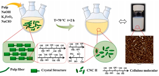 随着高科技产业对绿色材料需求的增加,纤维素纳米晶体(CNCs)作为一种天然纳米材料,因其独特的结构和优异的性能备受关注,其中,CNC Ⅱ因具有较高的热稳定性和乳化能力,在纳米复合材料领域展现出巨大潜力。然而,传统制备方法复杂且易造成环境污染。来利国际旗舰厅周立娟/张建明研究团队进行了关于Ⅱ型纤维素纳米晶体(CNC Ⅱ)制备的创新研究。研究团队创新性地提出了一锅法制备CNCⅡ的新策略,优化了反应条件,确定了最佳工艺参数,利用高铁酸钾(K2FeO4)在碱性环境下的强氧化性,结合少量次氯酸钠(NaClO),在5M氢氧化钠(NaOH)溶液中,实现了从棉浆到CNCⅡ的一步高效转化。制备的CNC II呈“棒状”形态,平均宽度约7nm,长度约269nm。X射线衍射(XRD)和拉曼光谱分析证实了CNC II的成功制备,且其结晶度指数高达71.4%。热重分析(TGA)显示,CNC II的热稳定性优异,起始降解温度超过310°C。该方法不仅简化了制备流程,减少了环境污染,还显著提高了产率,最大可达45.14%。研究还发现,CNC II在无需表面活性剂的情况下,能有效稳定高内相Pickering乳液,为食品、化妆品和制药等工业领域提供了新的应用可能。这一研究成果不仅为CNC II的大规模制备提供了绿色、高效的新方法,还推动了其在高附加值纳米复合材料领域的应用,展现了广阔的应用前景和科研价值。