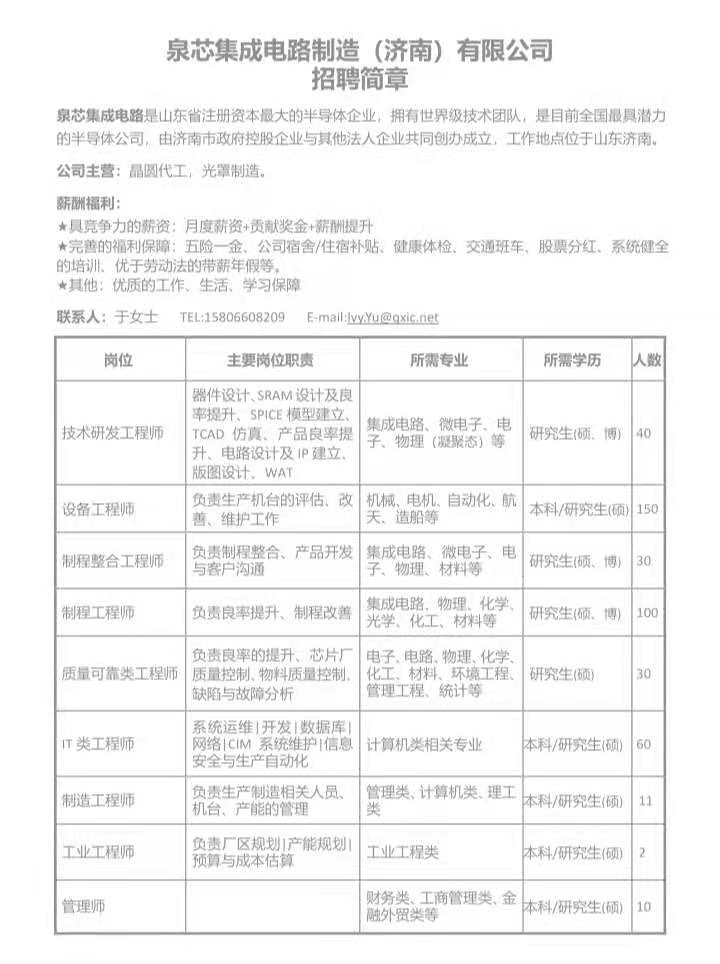 【就业信息】泉芯集成电路制造(济南)有限公司招聘简章