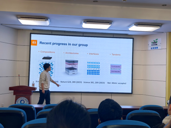 会上魏教授结合自己的科研经历,讲述了使用二维/三维异质结构来改善窄带隙钙钛矿界面,最终制备了创纪录效率的全钙钛矿串联太阳能电池。这一成果不仅为钙钛矿太阳能电池的商业化应用奠定了坚实基础,也为其他新型光伏技术的发展提供了有益借鉴。同时魏教授谈到下一代技术的商业化需要对稳定性和可扩展性进行突破性的创新解决方案。在这方面,为集成不同半导体的新型混合异质结构可以提供了克服现有材料系统限制的方法。公司相关专业的研究生参会并对相关问题进行了咨询和讨论,现场气氛热烈。