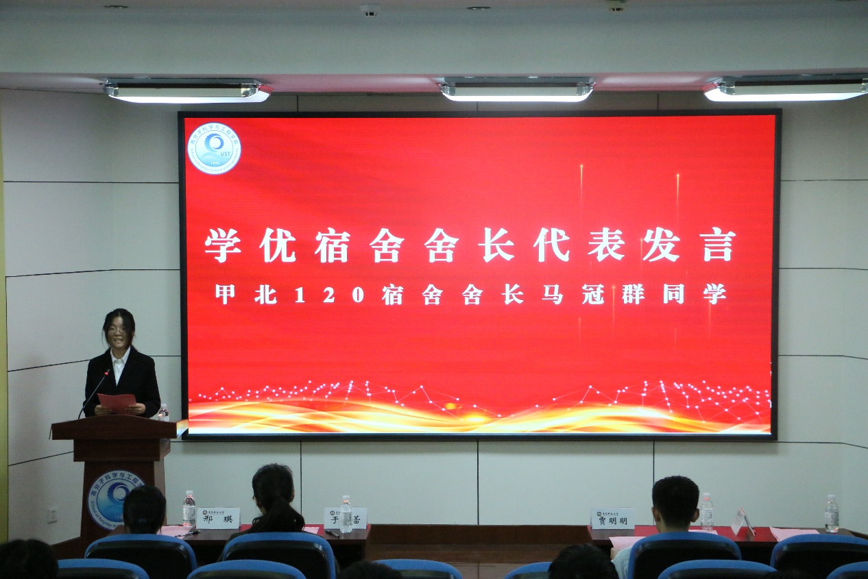 学优宿舍代表慧园甲北120宿舍舍长马冠群同学向同学们分享了处理宿舍关系的经验,希望同学们珍惜这份来之不易的缘分,用心经营宿舍关系,提升宿舍的居住环境,增强宿舍成员间的凝聚力与责任感,促进文明、健康、和谐的宿舍文化建设。
