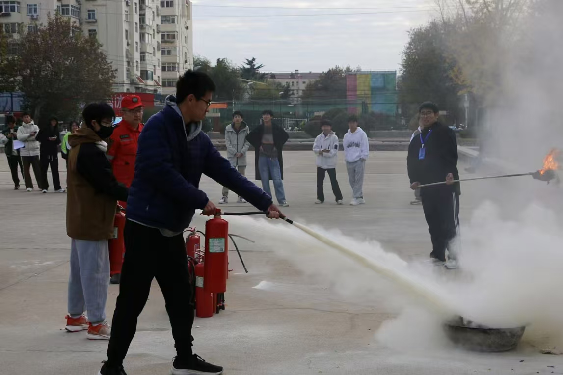 疏散完成后,仇立峰老师为师生们讲解了灭火器材的用途和使用方法,各班同学仔细观摩并选派代表参与体验,在“提—拔—握—压”的灭火器规范化使用流程下,将燃烧的火焰迅速熄灭。员工们认真学习,积极参与灭火实践,有效提升了扑救初期火灾的能力。