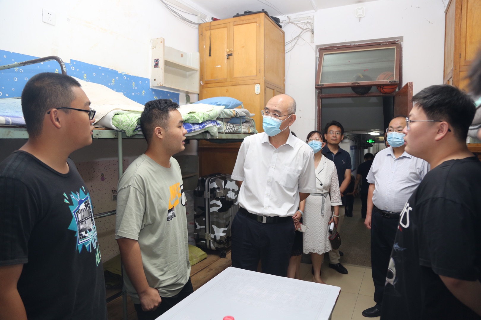 每到一个宿舍,陈董事长都亲切的询问员工返校路上的情况、学习安排以及入校后核酸检测过程,并给同学们详细介绍了公司的疫情防控措施和宿舍调整方案。耐心细致的了解员工对宿舍调整工作的意见建议,他向员工介绍了公司暑期图书馆、运动场等“八大改造工程”,以及持续改善员工学习、生活条件的相关举措,叮嘱同学们要加强个人卫生及防护,保持良好学习生活作息规律,勤奋学习。