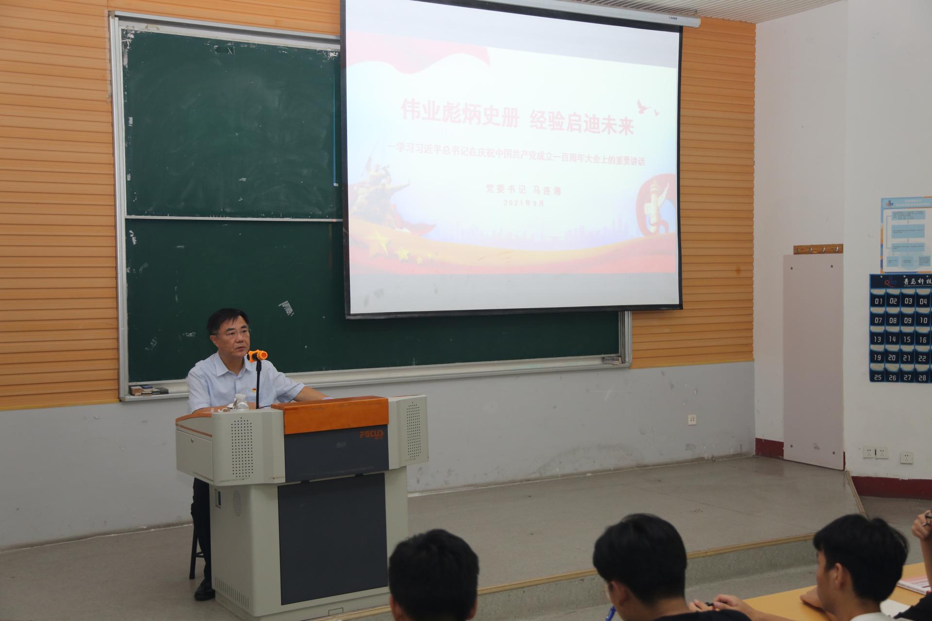 马连湘从“一个大事、四个阶段、一个精神、九个必须、三个要求”五个层面,结合党史中的重大事件和党带领中国人民为实现中华民族伟大复兴不懈奋斗的历史进程,深入浅出、生动形象地带领同学们一起学习了习近平在庆祝中国共产党成立一百周年大会上的重要讲话精神,切实推进讲话精神进课堂、进头脑。马连湘指出,100年来中国共产党弘扬“坚持真理、坚守理想,践行初心、担当使命,不怕牺牲、英勇斗争,对党忠诚、不负人民”的伟大建党精神,带领中国人民实现了从不挨打、不挨骂到不挨饿的巨大进步,带领中华民族实现了从站起来、富起来到强起来的伟大飞跃,全面建成了小康社会,实现了第一个百年奋斗目标,这是中华民族的伟大光荣,是中国人民的伟大光荣,更是中国共产党的伟大光荣,在中华民族的发展历史进程中具有重要意义。马连湘表示,只有看清楚过去我们为什么能够成功,才能弄明白未来我们怎样才能继续成功,以史为鉴、开创未来,我们要认真学习百年党史,充分汲取奋进力量。今天,我们已经发展成为具有重大全球影响力的世界第一大执政党,未来,我们必须继续为实现人民对美好生活的向往不懈努力,努力为党和人民争取更大光荣!