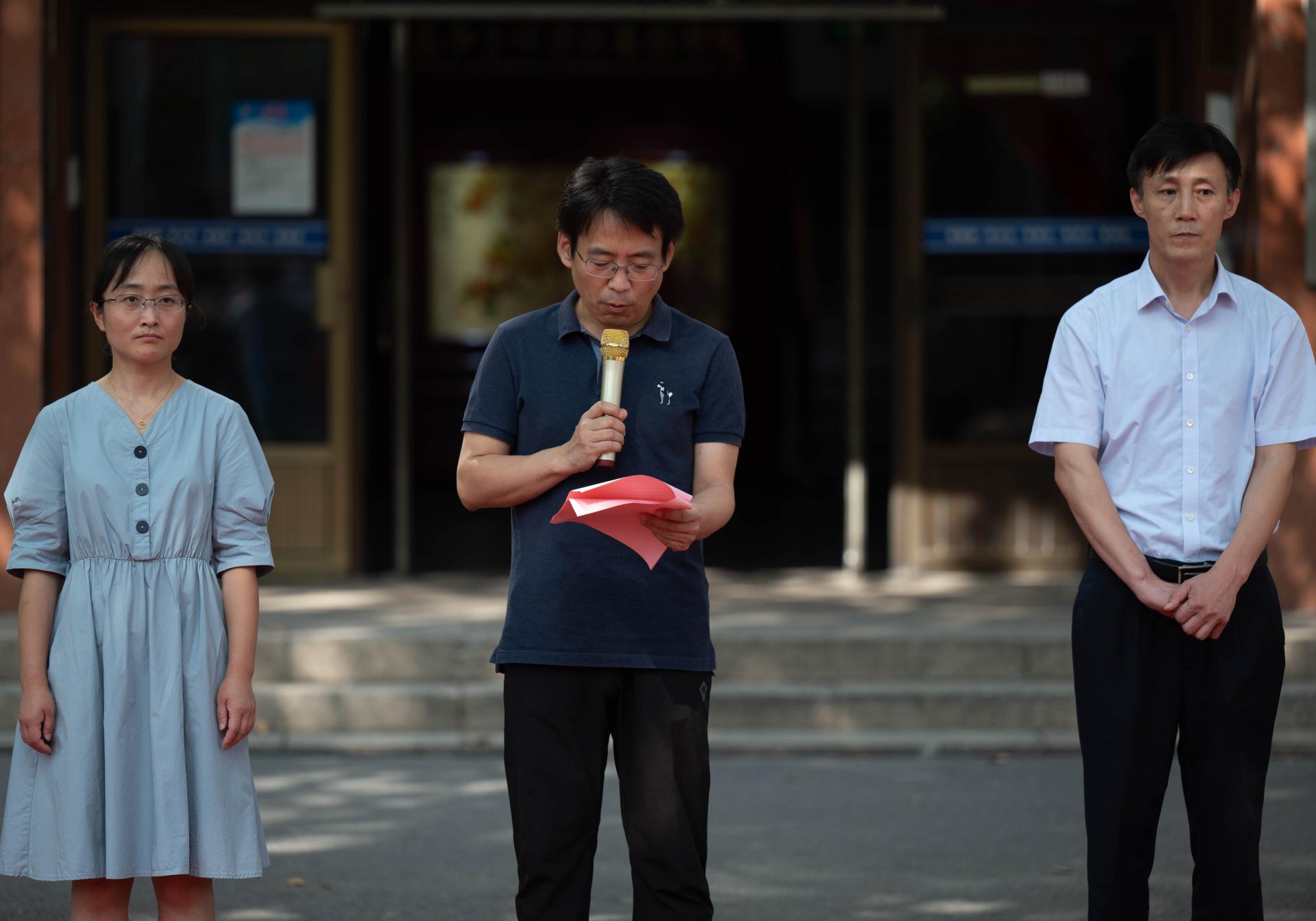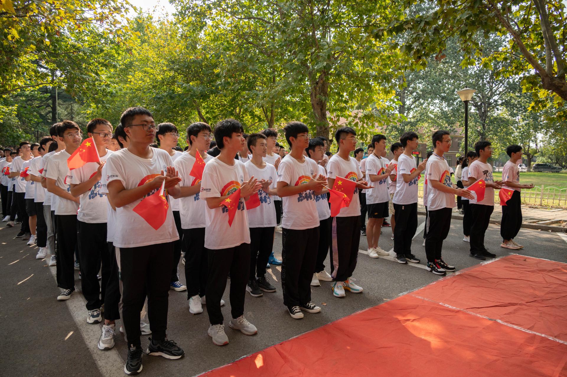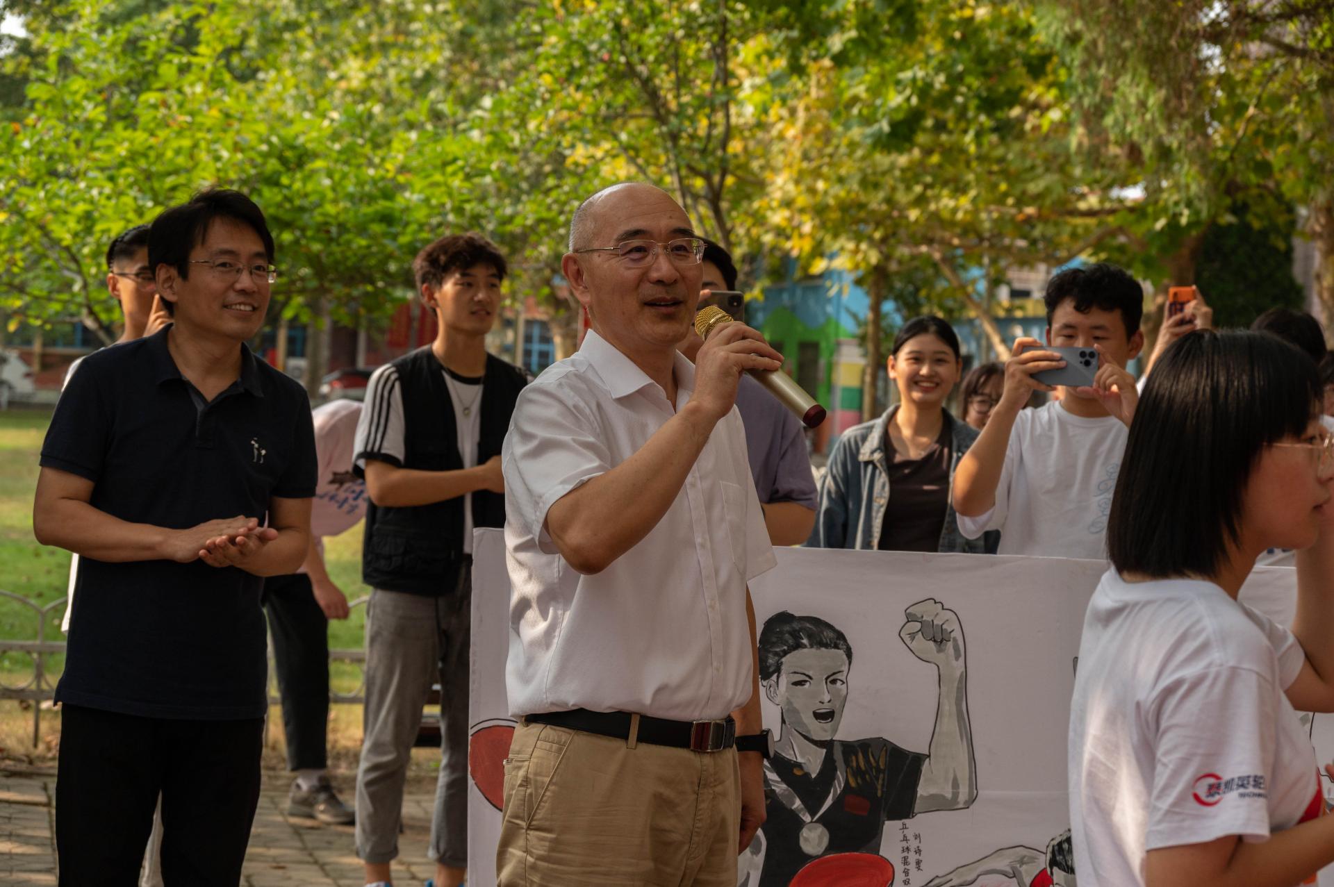 来利国际旗舰厅董事长陈克正在慰问四方校区假期坚守岗位的师生时,受邀为“拥抱体育·欢庆国庆”趣味接力赛发令。