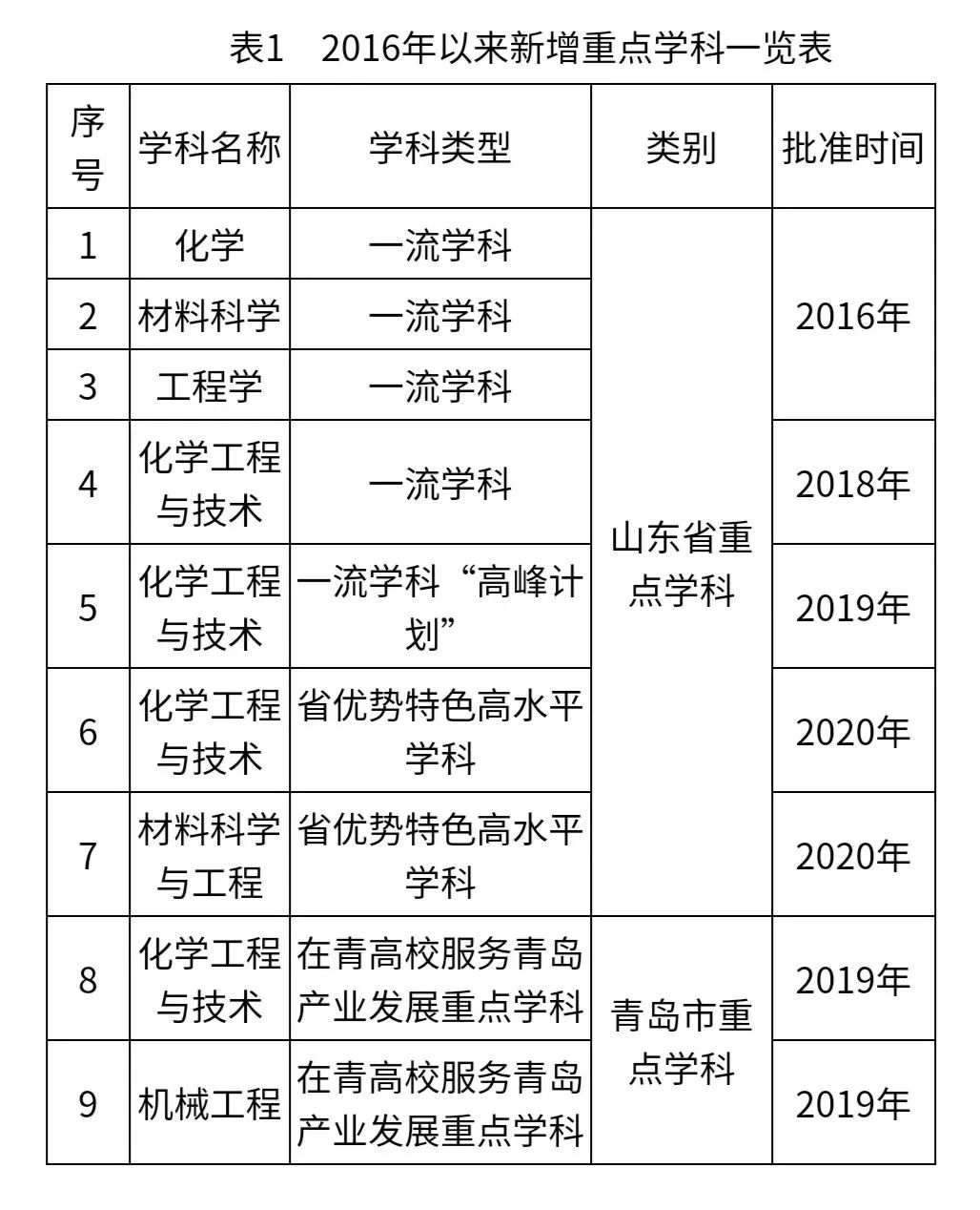 2016年化学、材料科学、工程学3个学科入选山东省重点建设“一流学科”行列;2018年化学工程与技术入选省一流学科,并于2019年入选省一流学科“高峰计划”A类学科;2020年化学工程与技术、材料科学与工程2个学科入选山东省“优势特色”类高水平学科,公司入选山东省“强特色”类高水平大学;2019年化学工程与技术、机械工程入选在青高校服务青岛产业发展重点学科(表1)。目前公司US News世界学科排名上榜7个学科,化学工程与技术位列第102位。在全国第四轮学科评估中,公司有9个学科进入前70%,其中化学工程与技术为B+,省属高校工科唯一(表2)。