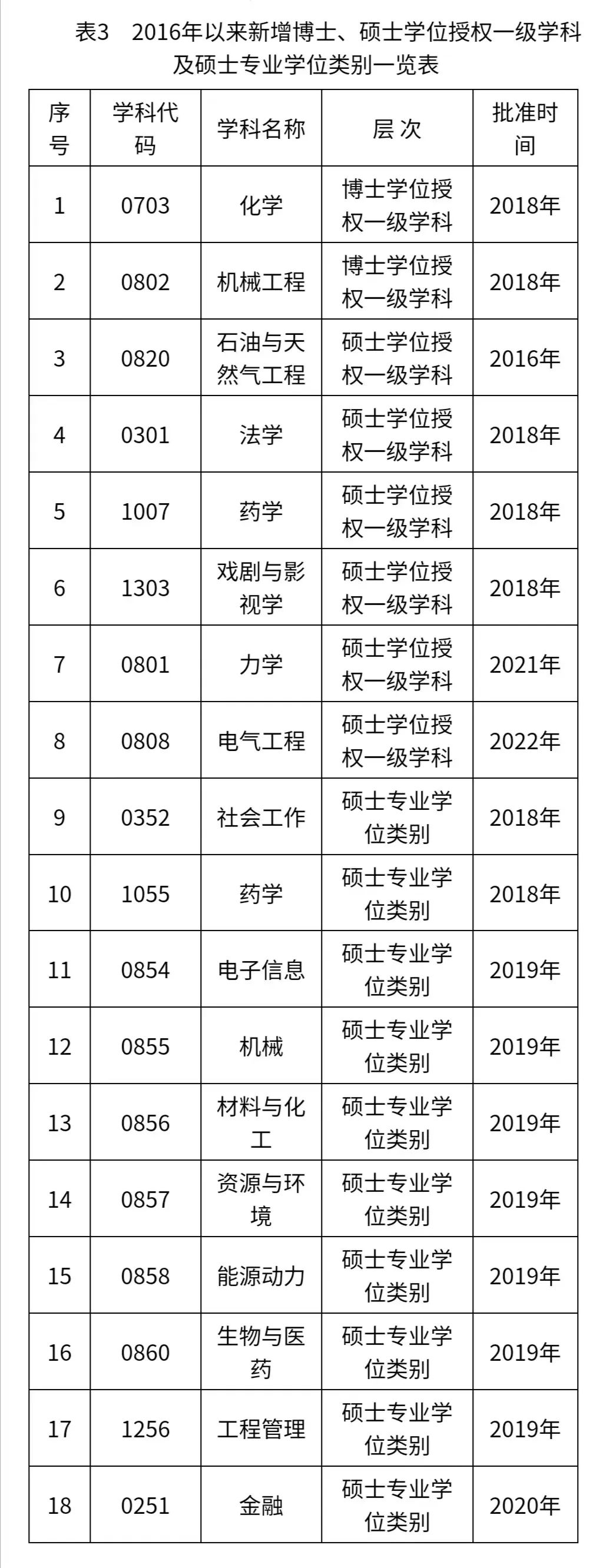 自2016年以来,公司获批化学、机械工程2个博士学位授权一级学科,法学、药学、戏剧与影视学、力学、电气工程5个硕士学位授权一级学科,社会工作、药学2个硕士专业学位类别。在工程硕士专业学位授权点对应调整工作中,将12个工程领域调整成电子信息、机械、材料与化工、资源与环境、能源动力、生物与医药、工程管理7个专业学位类别。公司坚持“有所不为”原则,主动撤销发展前景不好的精密仪器及机械、情报学2个硕士学位授权点,对应调整增列石油与天然气工程、金融2个硕士学位授权点(表3)。截至目前,公司共有5个博士学位授权一级学科,24个硕士学位授权一级学科,16个硕士专业学位类别,实现了各教学公司硕士一级学科授权点全覆盖。