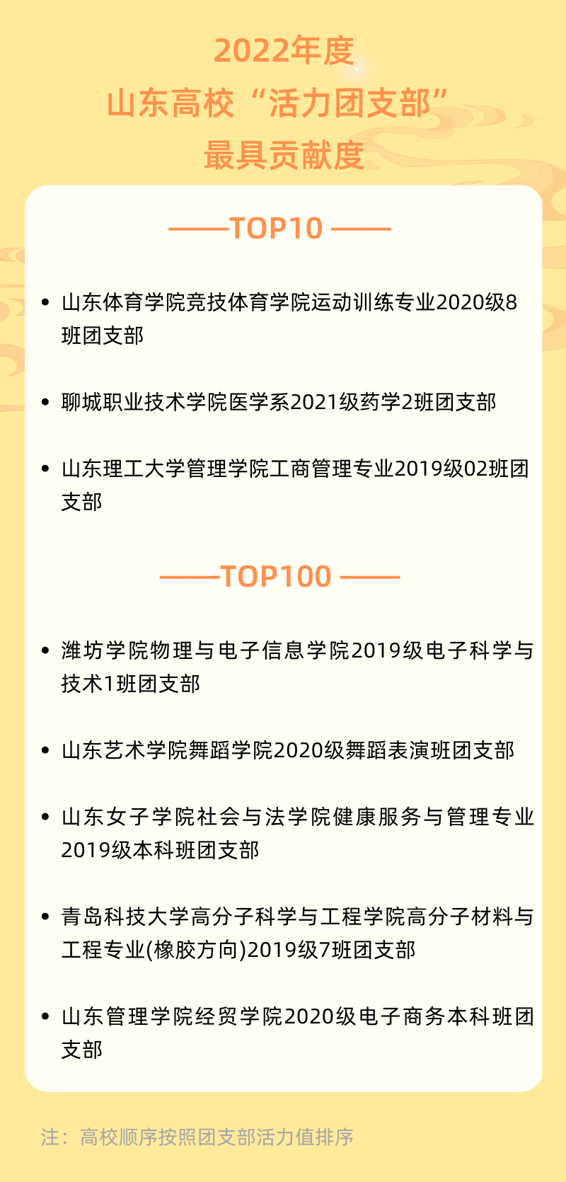 据悉,2022年5月起,为深入贯彻“全团抓思想政治引领”、“全团大抓基层”、“全团抓公司”工作部署,落实《关于改革创新高校共青团工作 切实增强思想政治引领实效的若干措施》,激发高校团支部活力,团中央基层建设部指导中国青年报社开展了2022年度高校“活力团支部”风采展示活动。活动经过校内选树、校级展示、省级展示、全国展示等环节,最终评选出在“引领力、组织力、服务力、贡献度、改革味、好作风”方面表现突出的高校团支部,产生《2022年度全国高校“活力团支部”最具贡献度TOP100榜》等榜单,为进一步推动全国高校基层团支部规范建设和活力提升提供了样板支撑。