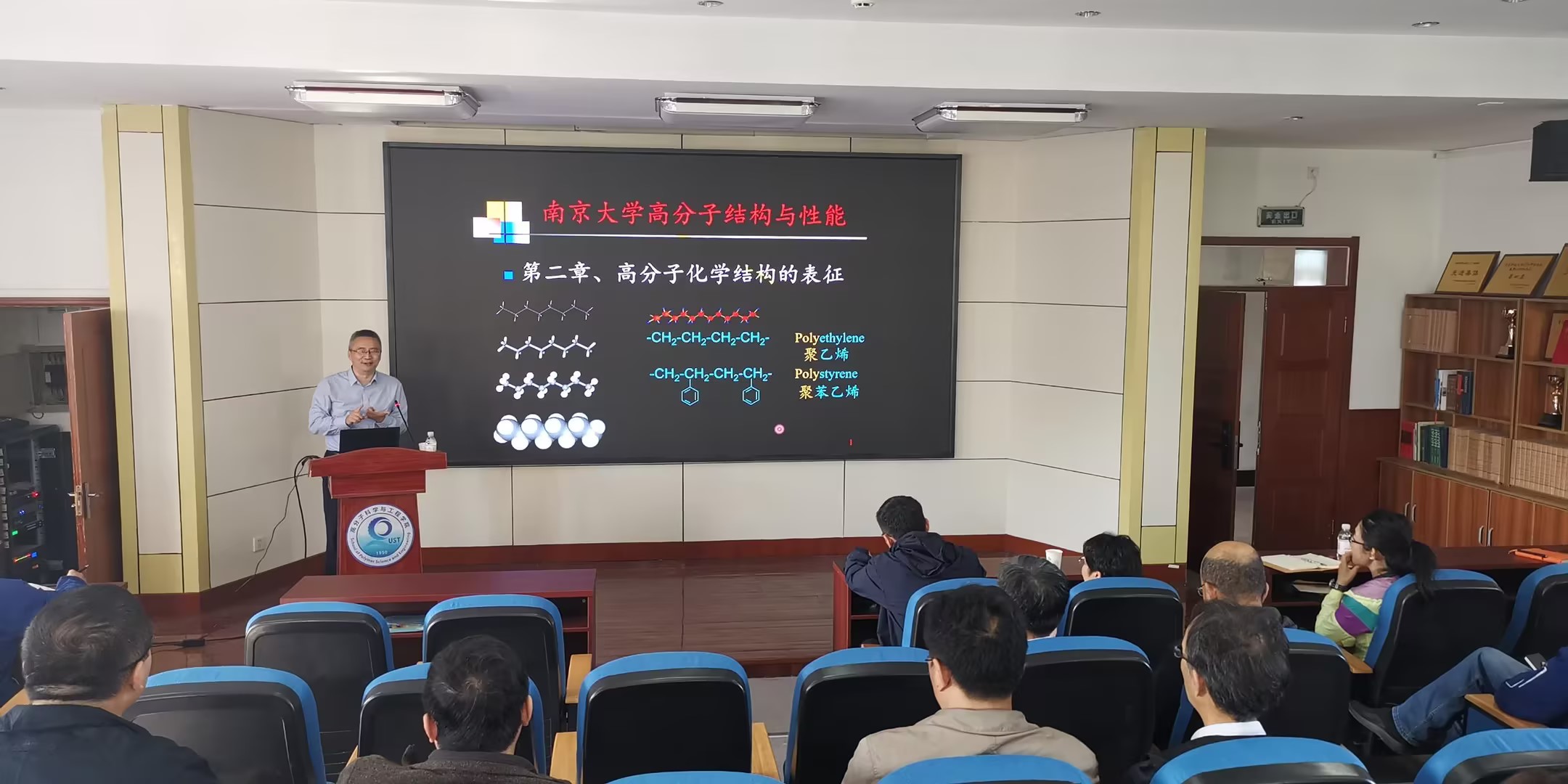 胡教授首先就“高分子链结构”进行了一节课时长的精彩教学示范,他利用自己深厚的学科功底,注重高分子物理在科学进化史中与传统物理学知识体系的关联,将一个个概念的来龙去脉生动有趣的呈现在师生面前,全体师生深受启发。胡教授的报告视野开阔、逻辑严谨、思想深邃、内涵丰富,是一场科学思维的盛宴、一次科学精神的洗礼,师生受益匪浅。