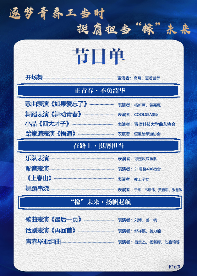第三篇章——“橡”未来,扬帆启航。毕业从不是重点,而是下一阶段蓄力前行的起点,当以梦为楫,扬帆起航。《最后一页》回顾过去,并激励观众珍惜当下,勇敢地迈向未来;燎原剧社和辅导员崔伟、邢瑛老师带来的《再回首》重走充满青春与梦想的日子,回味友情、爱情、师生情的交织碰撞的美好岁月;在歌曲串烧《青春毕业组曲》中,晚会缓缓落下帷幕,毕业生代表、毕业年级辅导员老师及全体演职人员以一曲《再见》表达了毕业季浓浓的不舍情绪,更表达了对所有毕业生真挚的祝福。