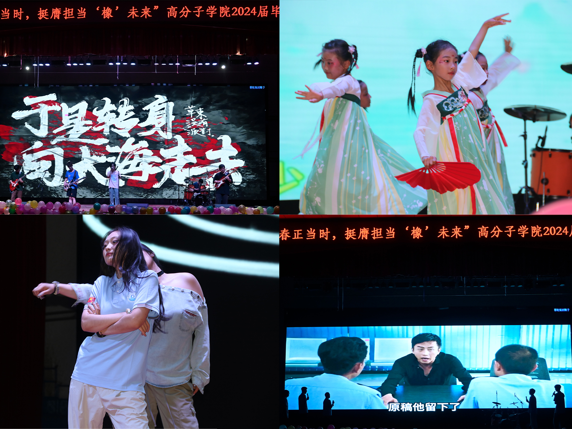 第二篇章——在路上·挺膺担当。青春当奋斗,未来已来,使命在肩,锚定新目标,做挺膺担当新青年。四方校区“可逆反应”乐队,用音乐诠释过去的四年,带大家感受青春的激昂与不舍;21号楼406宿舍的同学带来的配音表演带领观众感受语言的魅力与乐趣,重现经典回忆;“山上儿童放纸鸢,山下游人追画船”来利国际旗舰厅教工子女的《上春山》展现春天之生机勃勃,更激人奋进;由本硕毕业生和辅导员王亚宁老师为我们带来的舞蹈串烧,以他们帅气的舞步和有力的动作诠释青春的无限可能。
