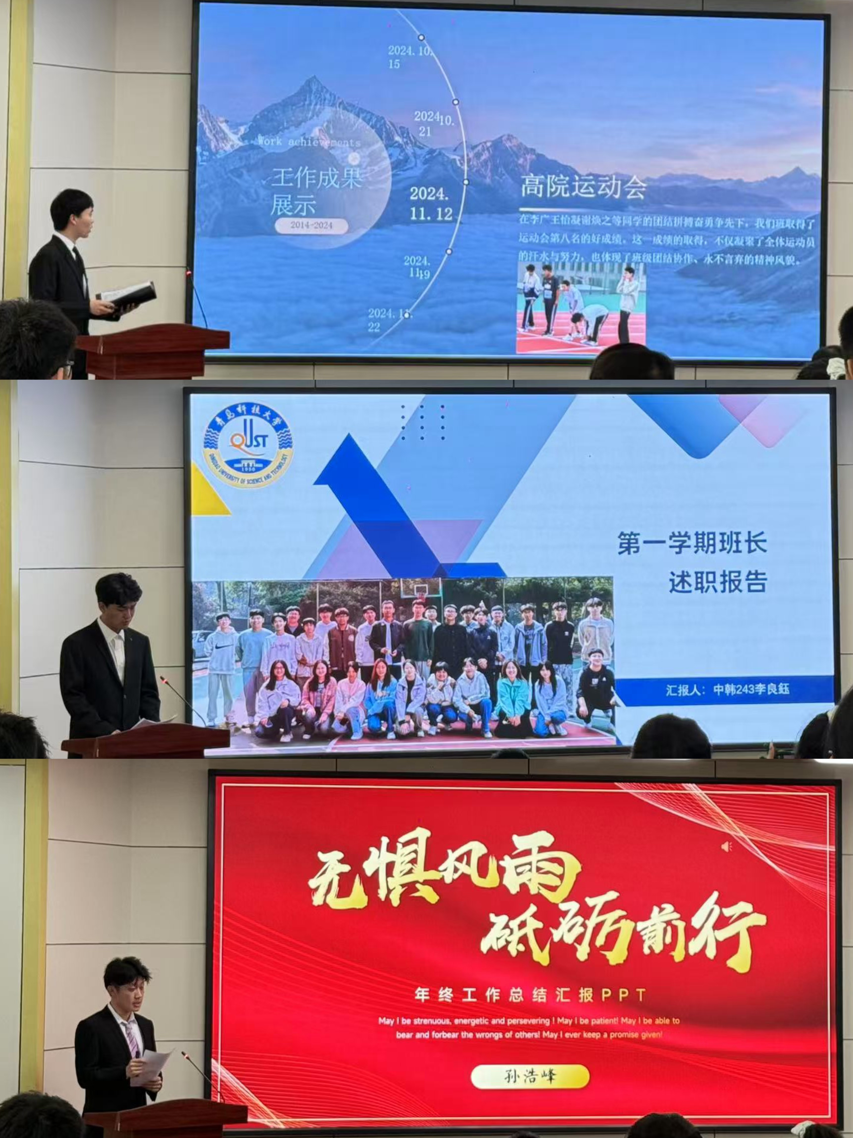 本次共计21个班级42名班委参与述职。各班员工干部围绕“班级建设成果、工作创新亮点、问题反思与改进计划”三大板块展开。述职中,班委们以PPT、视频、数据图表等形式,系统梳理了大一上学期班级学风建设、活动组织、朋辈关怀等工作的成效。例如,橡胶244班推出“线上学业帮扶群”,通过全员轮流讲解知识点的方式,有效提升班级平均成绩,实现了班级自我服务、自我管理、自我教育、自我监督的意义;塑料241班从德智体美劳五个方面介绍了班团工作,实现班级管理工作的全面化、清晰化、条理化;橡胶247班通过开创“吐槽大会”平台,为员工疏解情绪提供必要窗口,增强班级凝聚力的同时获员工广泛好评。
