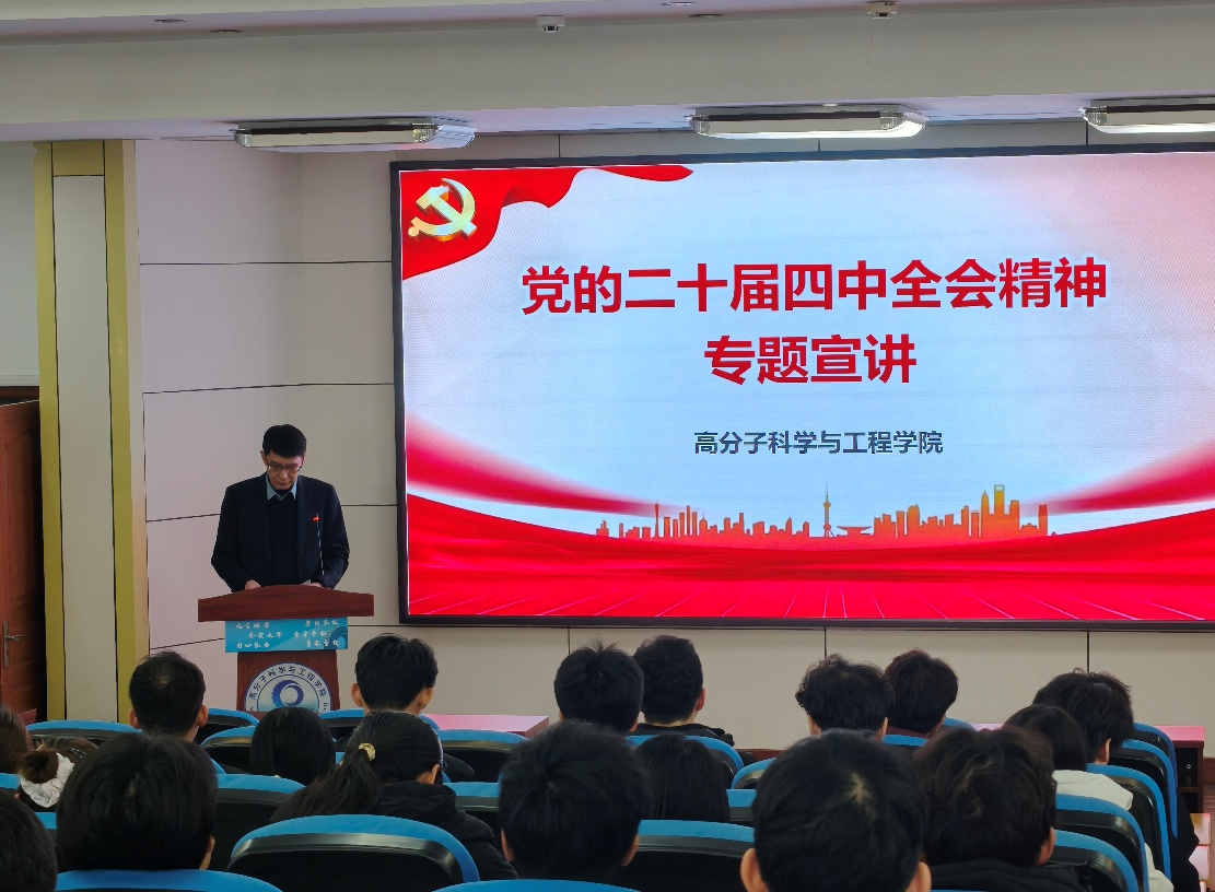 宣讲会上,宣宗伟围绕党的二十届四中全会精神展开系统解读。他阐述了全会召开的时代背景与重大意义—此次全会是在“十四五”目标任务即将胜利完成、向基本实现社会主义现代化迈进的关键节点召开的重要会议。全会审议通过的《中共中央关于制定国民经济和社会发展第十五个五年规划的建议》,作为全面建设社会主义现代化国家新征程上的第一个五年规划建议,为国家未来发展擘画了宏伟蓝图。他指出,青年学子尤其是党员和入党积极分子,要将个人成长与国家需求紧密结合,把全会精神转化为专业学习的动力,努力成长为国家高分子材料领域急需的高素质人才,以科技创新助力产业升级,在相关领域展现青年党员担当。