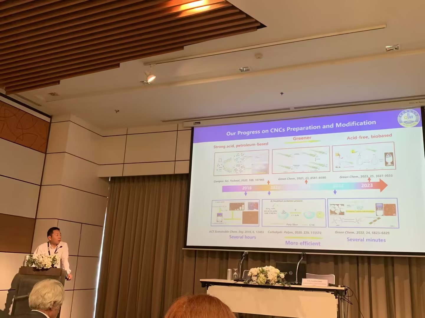 大会报告环节,德国橡胶技术研究所、京都大学、西安交通大学、印度JK轮胎工业有限公司、英国玛丽女王大学等机构的专家学者,围绕“橡胶回收循环经济的边界与机遇”“应变结晶弹性体断裂力学”“AI驱动弹性体多尺度模拟”等重大议题分享顶层洞见,为全球橡胶产业绿色转型锚定方向。分论坛研讨中,各国团队聚焦关键技术突破展开深度对话,青科大代表团的报告成为现场焦点:张建明受邀发表《Cellulose Nanocrystal: Scalable Production and Innovation and Application》(纤维素纳米晶体:规模化生产与创新应用)专题报告,引发广泛热议;刘恒教授针对《Chemical Degradation of End-of-Life Tires》(废旧轮胎的化学降解)分享核心技术路径;华静教授、汤健老师联合呈现《Synthetic Strategies and Mechanistic Studies of Liquid Rubber》(液体橡胶的合成策略与机理研究)最新成果。教师团队通过与国际顶尖学者同台报告、深度研讨,不仅获取了学科前沿动态与产业技术需求,更有效拓宽国际学术视野,锤炼跨文化科研协作与学术表达能力,为团队国际化培养筑牢实践根基。