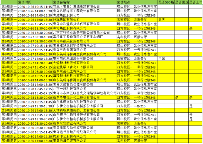 2020-2021学年第一学期第9周,进入公司进行校园宣讲招聘的企业名单如下,其中包含高分子材料专业相关(标底色)及不限专业的企业需求,请毕业生同学根据个人实际情况,按时参加企业宣讲会。