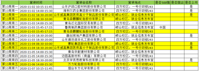 2020-2021学年第一学期第10周,进入公司进行校园宣讲招聘的企业名单如下,其中包含高分子材料专业相关(标底色)及不限专业的企业需求,请毕业生同学根据个人实际情况,按时参加企业宣讲会。