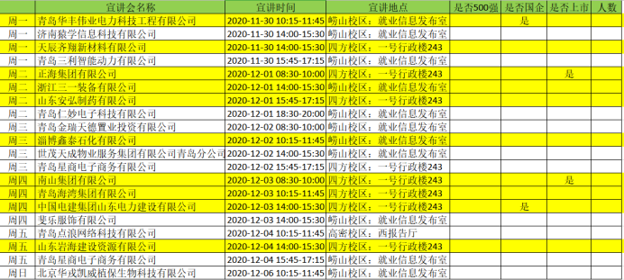 2020-2021学年第一学期第14周,进入公司进行校园宣讲招聘的企业名单如下,其中包含高分子材料专业相关(标底色)及不限专业的企业需求,请毕业生同学根据个人实际情况,按时参加企业宣讲会。