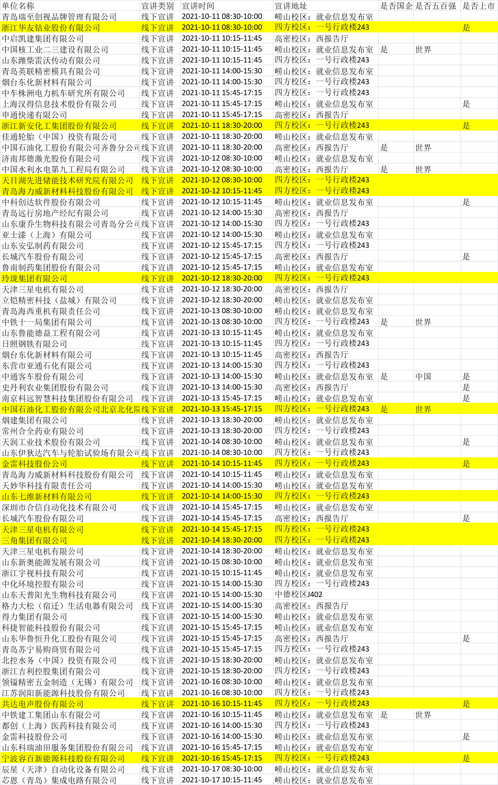 2022届硕士及本科毕业生: 2021-2022学年第一学期第6周,进入公司进行校园宣讲招聘的企业名单如下,其中包含高分子材料专业相关(标底色)及不限专业的企业需求,请毕业生同学根据个人实际情况,按时参加企业宣讲会。