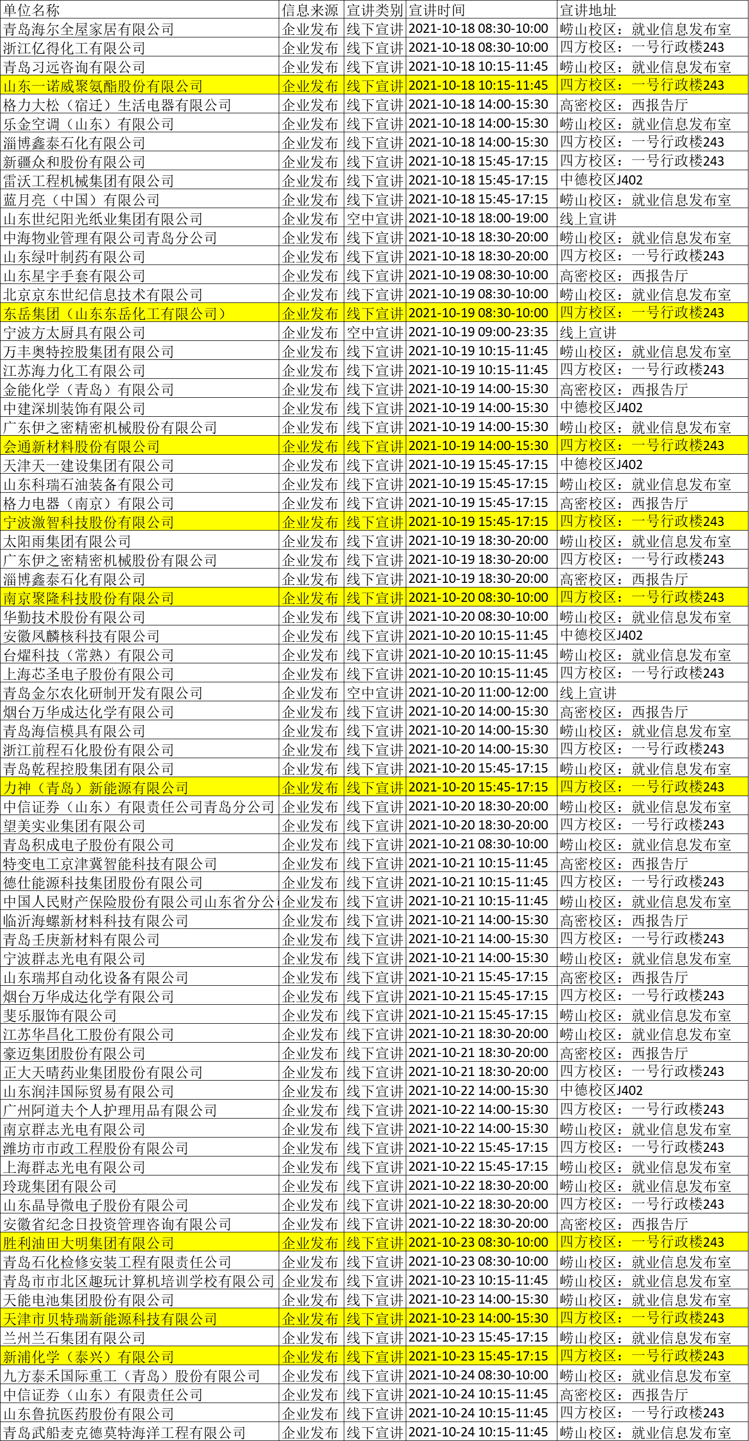 2022届硕士及本科毕业生: 2021-2022学年第一学期第8周,进入公司进行校园宣讲招聘的企业名单如下,其中包含高分子材料专业相关(标底色)及不限专业的企业需求,请毕业生同学根据个人实际情况,按时参加企业宣讲会。