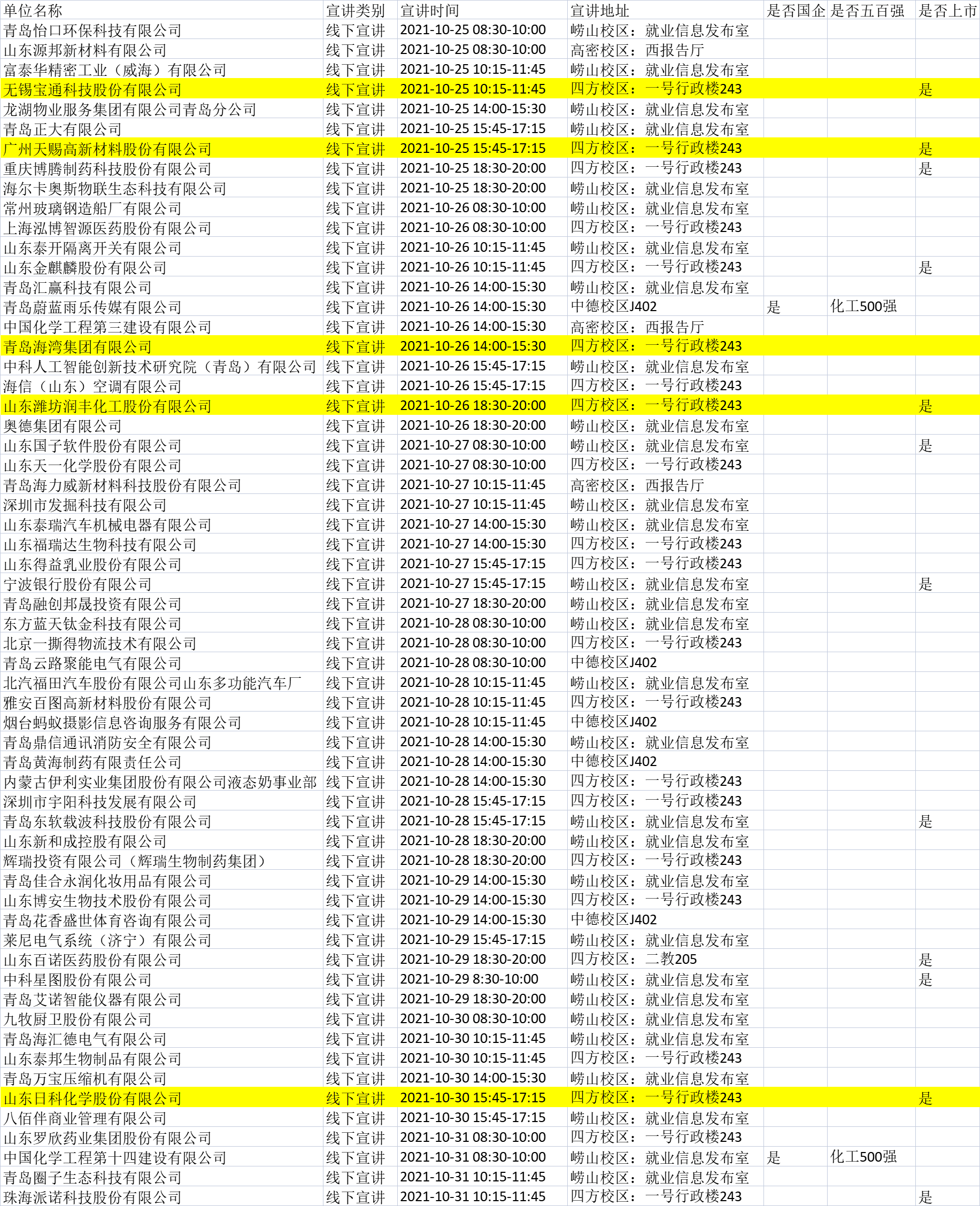 2022届硕士及本科毕业生: 2021-2022学年第一学期第9周,进入公司进行校园宣讲招聘的企业名单如下,其中包含高分子材料专业相关(标底色)及不限专业的企业需求,请毕业生同学根据个人实际情况,按时参加企业宣讲会。