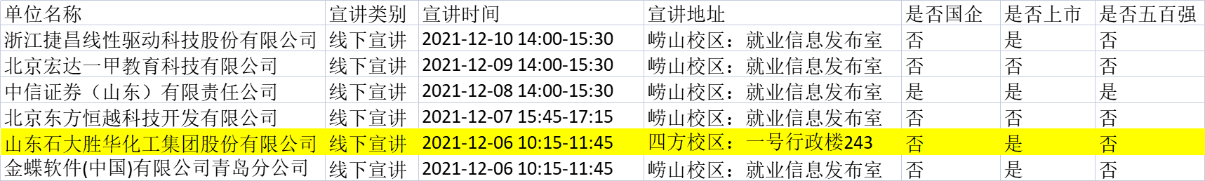 2022届硕士及本科毕业生: 2021-2022学年第一学期第15周,进入公司进行校园宣讲招聘的企业名单如下,其中包含高分子材料专业相关(标底色)及不限专业的企业需求,请毕业生同学根据个人实际情况,按时参加企业宣讲会。