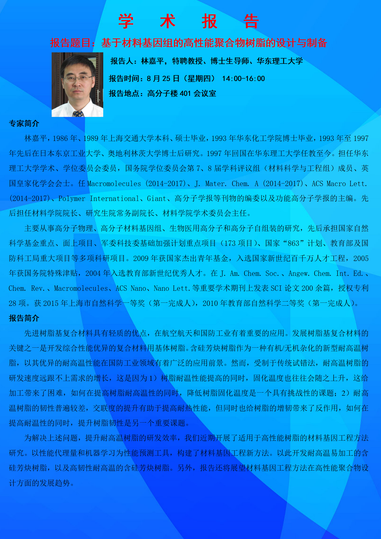 学术报告:基于材料基因组的高性能聚合物树脂的设计与制备